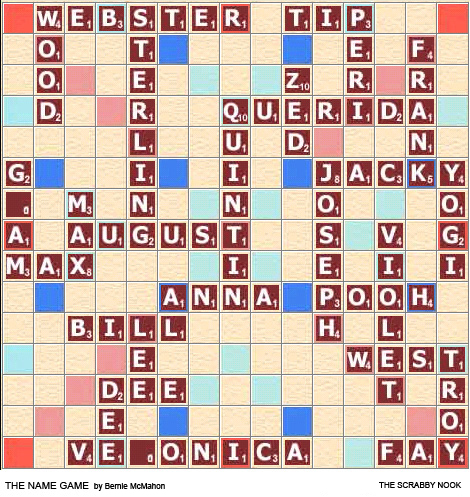 | A board with names only that are all good playing Scrabble words. The blanks are both R's. |
